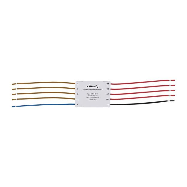Shelly 4 kanalų: ruda (I1–I4), mėlyna (N), raudona (O1–O4), juoda (Ʇ)